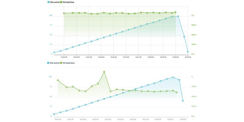 从上图可以看到,当到站点的流量激增时,BlueHost更加一致。即使访客数量增加,他们也设法保持稳定的加载时间。另一方面,iPage在开始时遇到了更多麻烦,但是随着更多用户的访问,他们设法稳定了它。