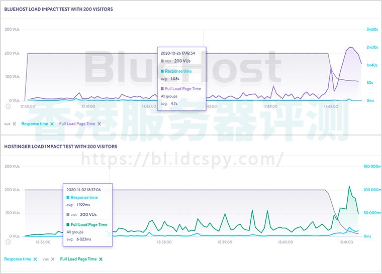BlueHost提供美国机房,支持全球CDN加速,所以全球各地都有不错的访问速度。Hostinger提供美国、香港、新加坡和英国等机房,访问速度也不错。为了更好的测试BlueHost和Hostinger的速度,我们分别对其进行负载影响测试,这次是模拟了200人在线测试现场,测试结果如下: