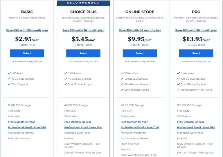 BlueHost的美国主机采用先进的内容交付网络Cloudflare,可以提高网站性能并缩短加载时间。目前共提供四种租用方案,分别是BASIC、CHOICE PLUS、ONLINE STORE和PRO,均赠送SSL证书、CDN和域名,并可免费试用专业电子邮件。
