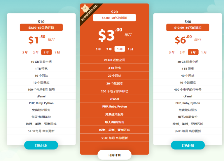 Hostens提供S10、S20和S40三种虚拟主机方案,提供易于使用的cPanel控制面板、免费建站服务和每天/每周备份,支持PHP, Python, Ruby, Git等,支持支付宝、PayPal和信用卡等付款方式,最低配置方案只需$1.50/月,具体方案配置如下: