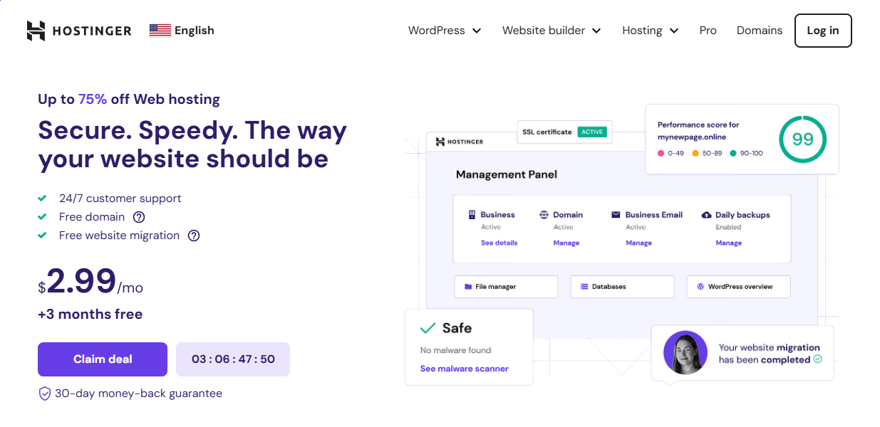 目前,Hostinger性价比最高的Premium主机方案,原价11.99美元/月,现在购买仅需2.99美元/月(减价75%),包含免费域名注册和SSL安全证书。
