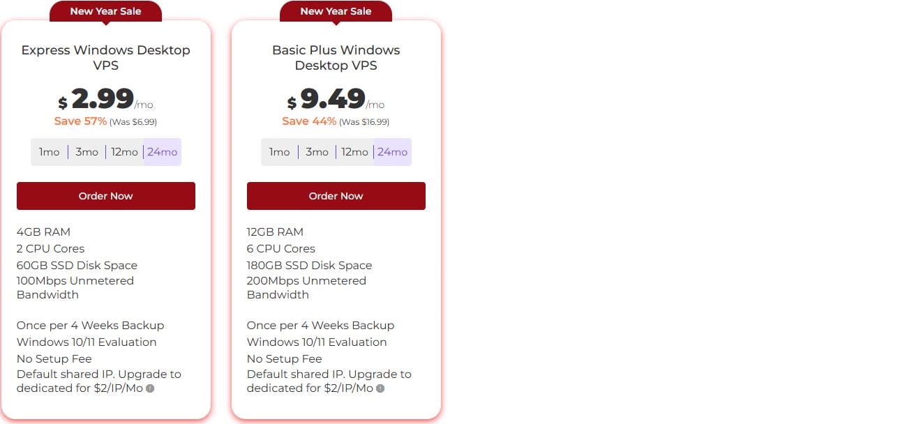 优惠方案起步3核6G配置,配备专用IP(默认为IPv4,IPv6需要联系客服),起步带宽100Mbps无流量限制,支持Windows Server 2025/2022/2019/2016系统,无设置费用。