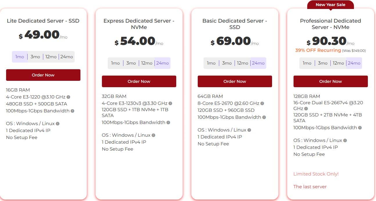 Database Mart起步配置4核E3-1220、16GB 内存,默认100Mbps-1Gbps带宽,支持Windows / Linux操作系统和1个专用IPv4地址(不支持IPv6),专用服务器同样无设置费用。其中$36.75/月的特价需选择首款方案的两年付周期。