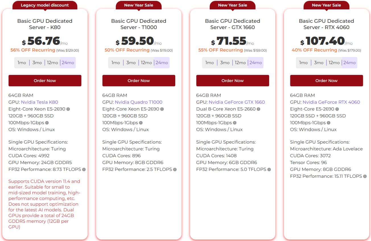 美国GPU服务器活动方案包括Nvidia Tesla K80、Nvidia Quadro T1000、Nvidia GeForce GTX 1660、Nvidia GeForce RTX 4060等GPU型号,支持Windows / Linux操作系统,FP32性能高达109.7 TFLOPS。
