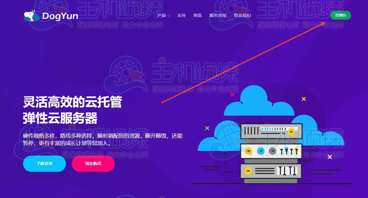 1、访问狗云官网(),点击页面右上角的“控制台”进入登录页面。如果已有账号直接登录;如果没有账号,需要先完成注册流程。