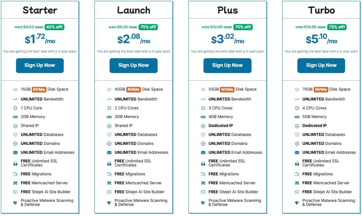 HawkHost虚拟主机共推出Starter、Launch、Plus和Turbo四种方案类型,其中Starter和Launch方案为共享IP,Plus和Turbo方案则配备了专用IP,其他则是配置规格的大小区别,根据自身网站需求选择即可。若无法抉择建议选择比目前网站稍宽裕些的资源,避免后期网站资源增加主机无法承载的难题。