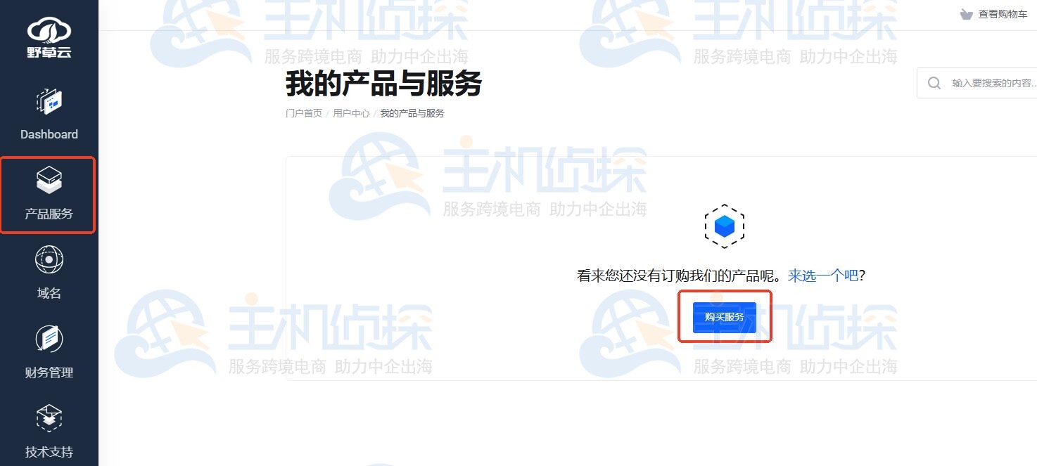 2、进入野草云后台,在左侧导航栏选择“产品服务”>“购买服务”。
