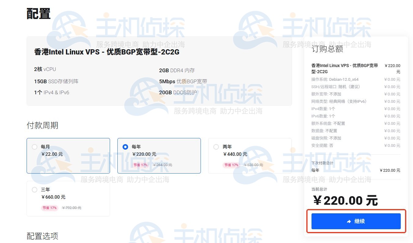 3、配置页面将自动应用野草云优惠码,结账时即显示折扣后的价格。