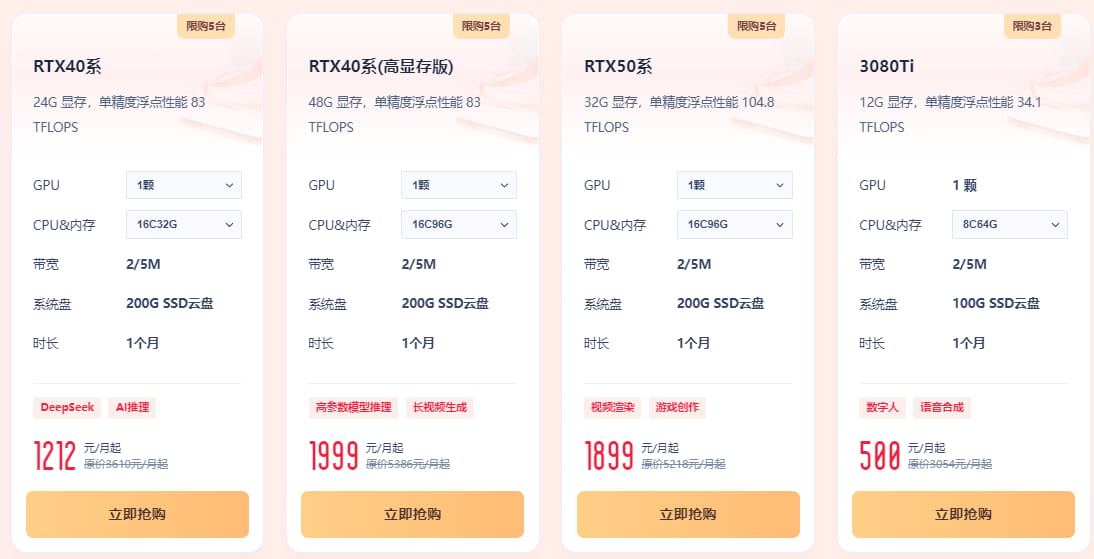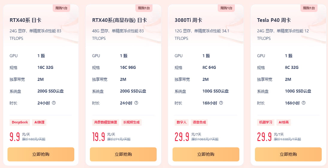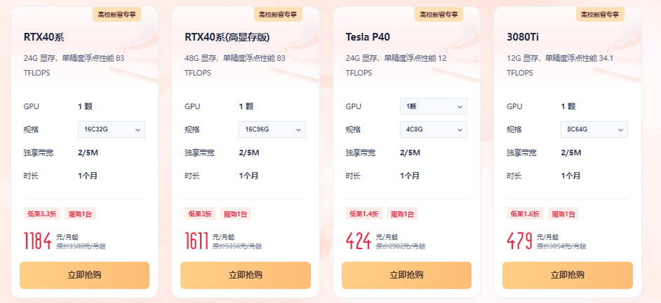 UCloud GPU算力新客尝鲜专区提供多种机型的可选,低至9.9元/天。
