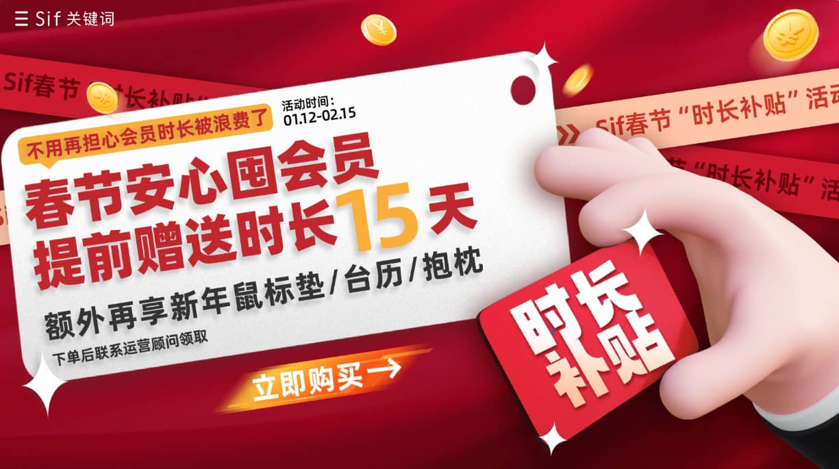 点击查看: 活动期间购买Sif关键词工具任意方案送15天时长,并且使用Sif关键词优惠折扣码(idcspy)享新购、增购、升级享受88折优惠;续费享受86折,额外再享新年鼠标垫/台历/抱枕(三选一) 过期时间: