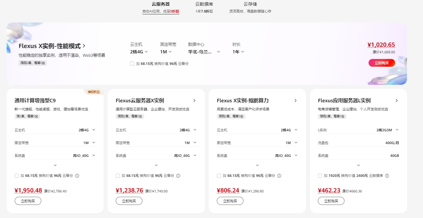 2026新春钜惠活动开始啦,全站年度销量TOP云产品均参与优惠。活动期间,Flexus云服务器新客3.3折低至558.83元/年;企业云服务器特惠低至3.3折,2核4G Flexus云服务器X实例低至1034.66元/年;云服务器、云数据库、云存储等全线产品5折起,新老同享,感兴趣的朋友快快行动吧。