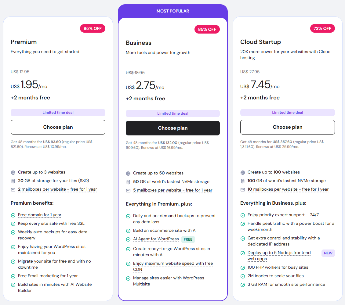 现在开始,购买Hostinger主机,入门级的Premium主机最低价格仅需1.95美元/月,降价幅度高达85%,最受欢迎的Business主机套餐价格降至2.75美元/月,降价幅度高达80%。