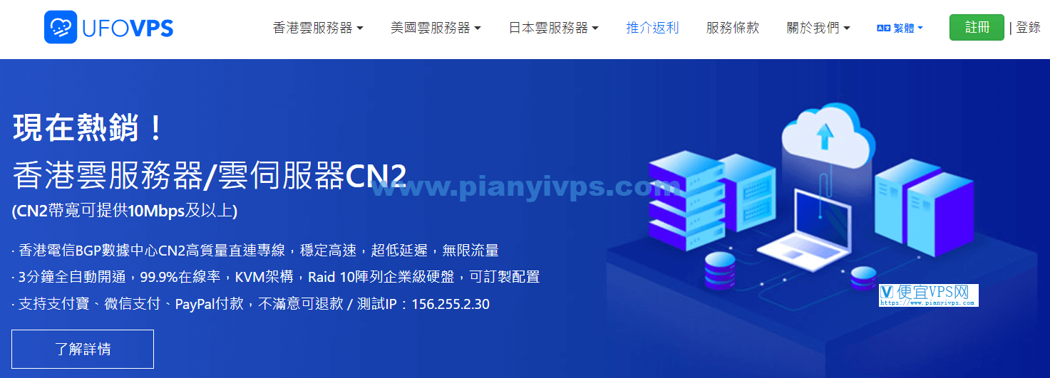 UFOVPS 是一家成立于 2015 年的香港商家,隶属于飞碟网络(香港)有限公司,是 APNIC(亚太互联网络信息中心)会员单位,主营香港 CN2 GIA 线路、香港宽频 HKBN 线路、日本 CN2 GIA 线路、美国洛杉矶 Krypt CN2 线路的云服务器,UFOVPS 支持 PayPal、支付宝、微信支付,不满意可以退款。