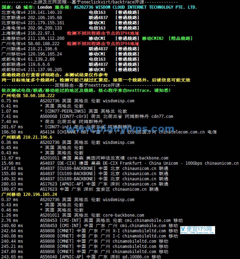 AMD EPYC 7002,主频 2800MHz,底层为 KVM 虚拟,启用了 BBR,不支持 IPv6,上游提供商为 wisdomisp,归属地为英国伦敦: