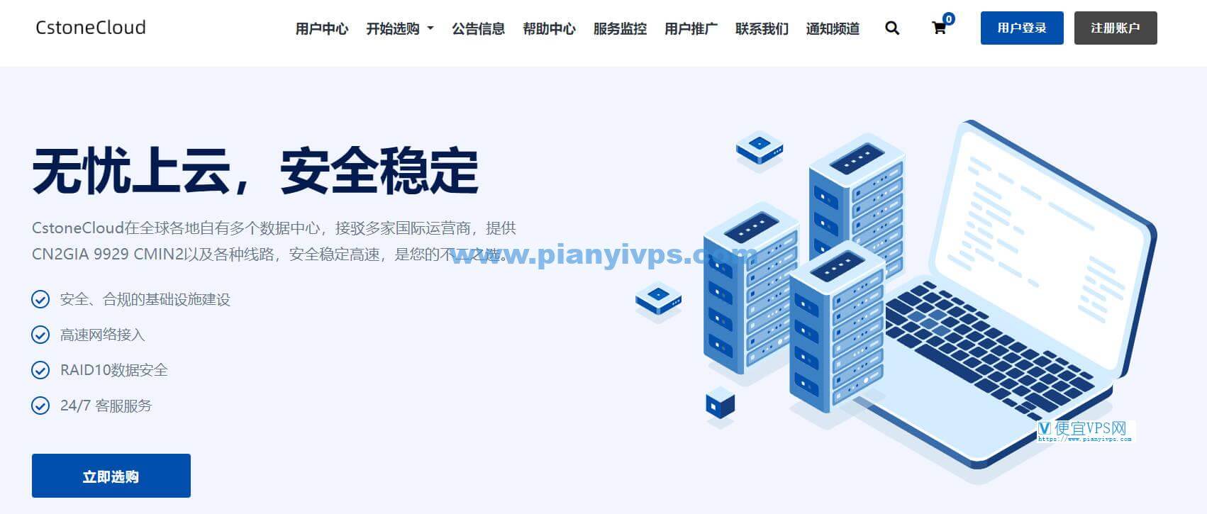 CstoneCloud 提供 KVM 虚拟化云服务器,采用 Intel Xeon 处理器,RAID 保护数据安全,高级别存储,99.9% 在线率,支持 Windows / Linux 系统。促销覆盖香港 CN2(电信 CN2 双向接入,移动 / 联通骨干网,30Mbps 下行统一体验)和美国 CUII 9929(直连 & 五网回程,住宅双 ISP 或原生 IP,解锁本土应用)。以下为促销套餐详情。