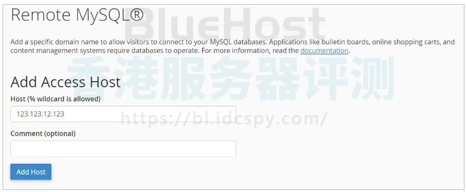 2、在“远程 MySQL”界面中,将要连接的 IP 地址输入到“主机”字段中,然后点击“添加主机”按钮。