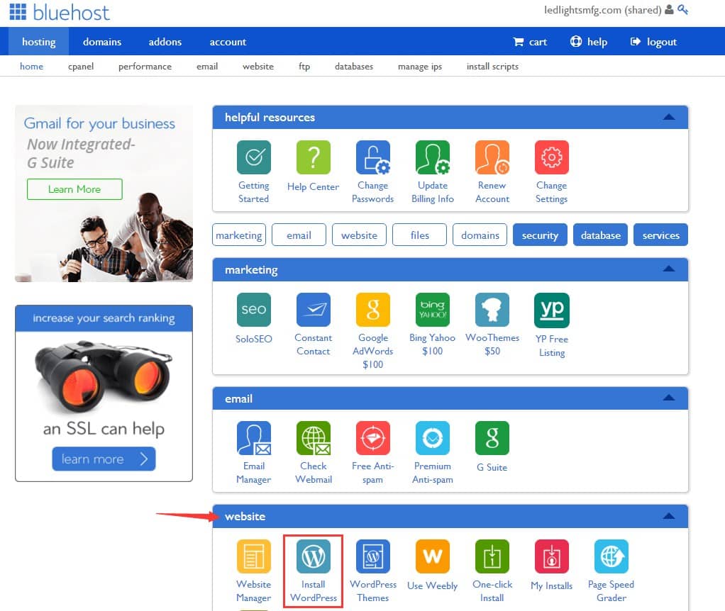 首先需要登录到BlueHost的后台。在这里,会看到一个如下面截图所示的界面。