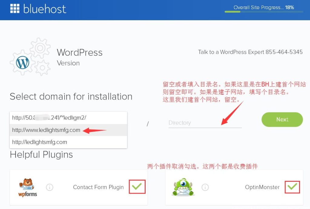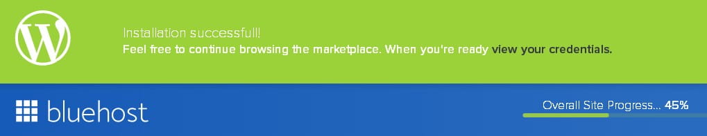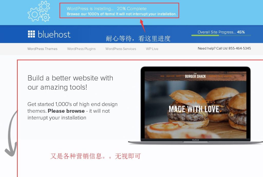接下来,系统将在后台自动进行安装。安装过程中,BlueHost可能会展示一些网站模板供选择,可以忽略这些内容,耐心等待安装完成即可。
