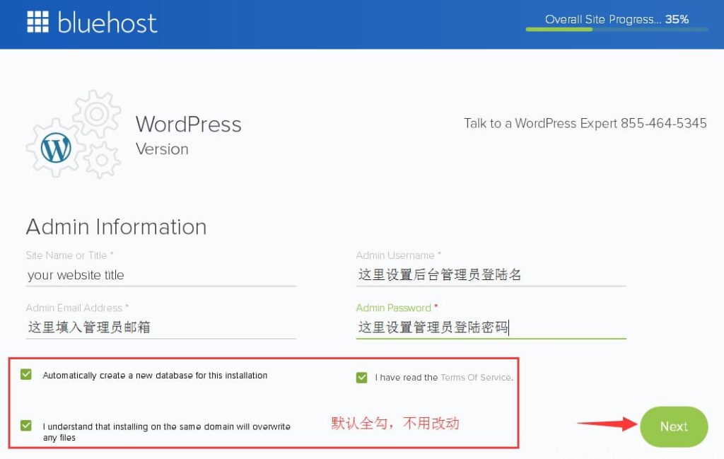 关于网站的名称,可以先随意填写,后续可以在后台随时修改。填写完毕后,请点击Next。