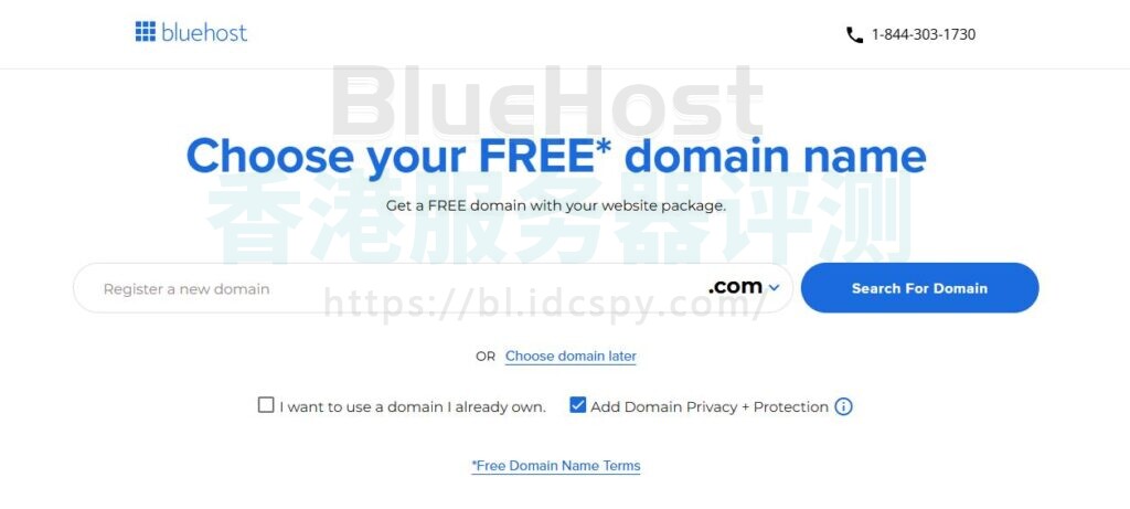 BlueHost主机为所有用户提供一年的免费域名注册,可以选择在BlueHost处注册,点后面列表选择域名后缀,然后点蓝色“Search For Domain”查看是否可注册。可免费注册的域名有:BIZ,.INFO,.COM,.NET,.ORG,.CO.UK,.US,.STORE,.CO,.TECH,.SPACE,.WEBSITE,.BLOG,.ONLINE,.SITE,选择注册其它域名要额外付费。