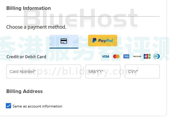 BlueHost支持绑定Visa、万事达、美国运通、JCB、Discover等国际银行卡付款,也支持绑定PayPal付款。