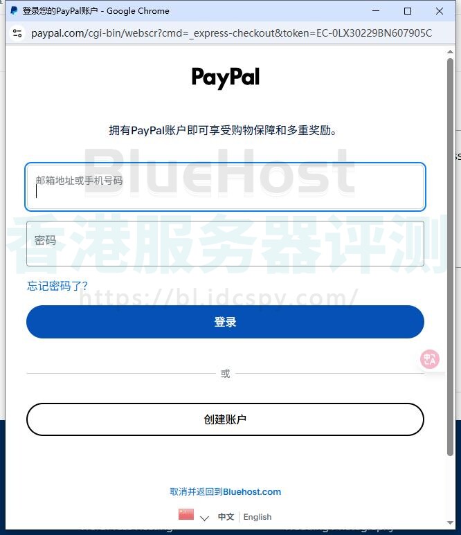 在选上PayPal后会自动弹出小窗到PayPal登录你的账户,或者创建个PayPal账户,完成后返回BlueHost购物车。PayPal账户中可绑定中国银联的借记卡(如遇到支付账单问题无法付款,请检查PayPal支付借记卡是否支持中国银联,可更换借记卡绑定付款)。